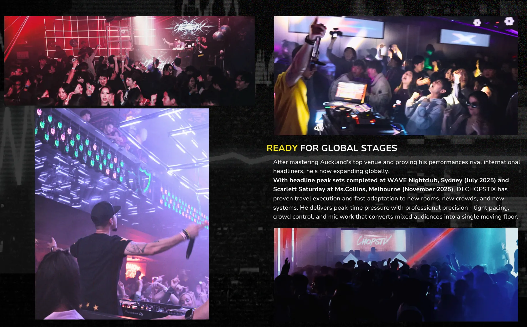 DJ + MC high-energy performance with control, pacing, and peak moments.
