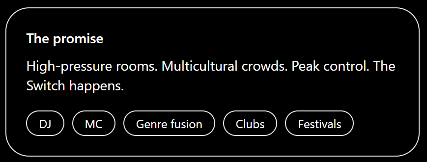 DJ + MC high-energy performance with control, pacing, and peak moments.